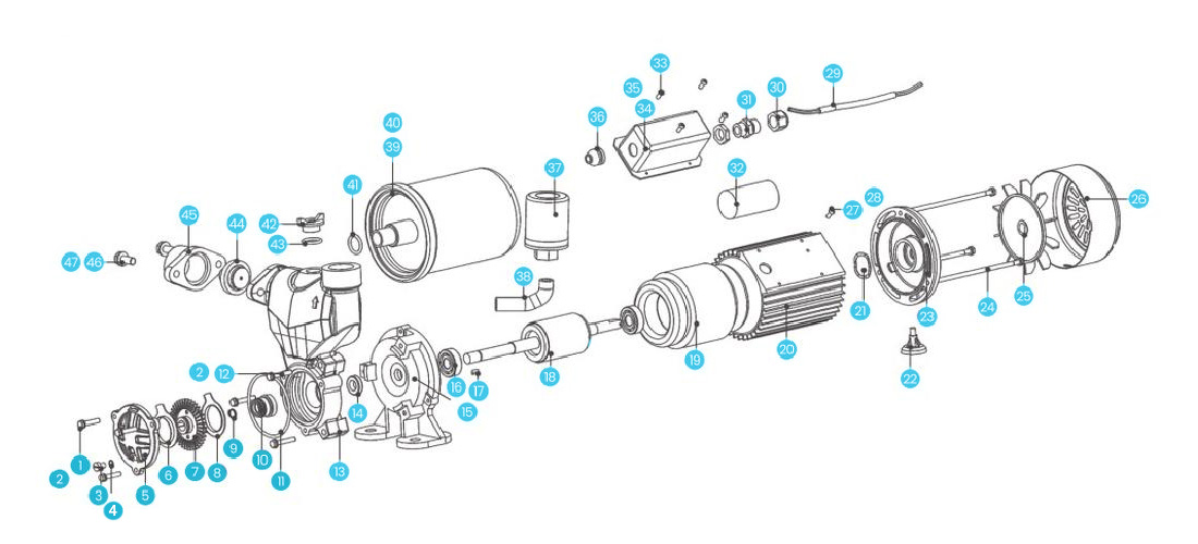 | 8 | таблетка корпуса насоса | 20 | Корпус с обмоткой статора | 32 | Конденсатор | 44 | обратный клапан | ||||||||
