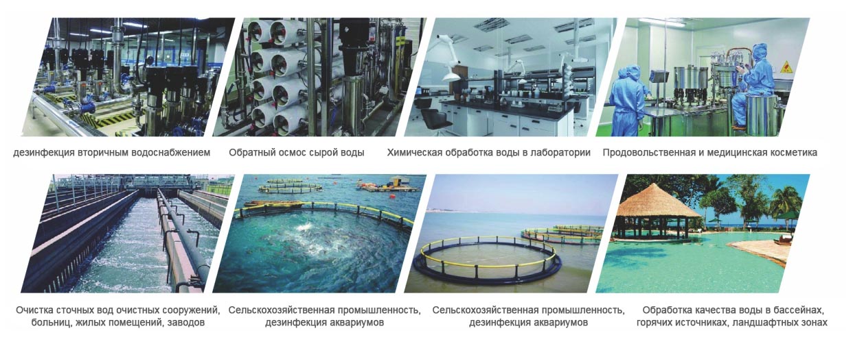 Стерилизация сточных вод: крупные и средние очистные сооружения, лабораторная дезинфекция воды, повторное использование воды, больничные медицинские сточные воды, очистка и дезинфекция воды в бассейне и т.д.