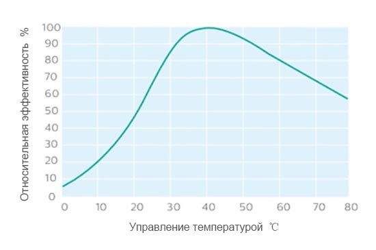Эффективность ультрафиолетового излучения ртутных ламп низкого давления напрямую связана с давлением ртути (насыщением), которое, в свою очередь, зависит от температуры холодной стороны лампы. Ультрафиолетовое излучение обеспечивает максимальную выходную эффективность при температуре около 40°С, как показано на рисунке 28. Циркулирующий воздух оказывает большое влияние на температуру стенки трубы, а использование более высокого напряжения может компенсировать охлаждающий эффект воздушного потока (или более низкую температуру окружающей среды). На рисунке 29 показано сравнение стандартных труб TUV PL - L 36W того же размера и труб 60W с «высокой мощностью». Вы можете увидеть результаты компенсации для указанной мощности.