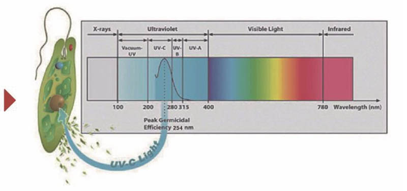 Общее название излучения ультрафиолетового электромагнитного спектра с длиной волны от 100 до 400 нанометров. Он расположен вне ультрафиолетового излучения в спектре, поэтому называется ультрафиолетовым светом и является невидимым светом. Согласно классификации ультрафиолетовых диапазонов CIE (международной комиссии по освещению) их можно разделить на UVA (320–400 нм), UVB (280–320 нм) и UVC (100–280 нм). Принцип ультрафиолетовой стерилизации: когда бактерии и вирусы, находящиеся в воде, подвергаются воздействию достаточной дозы ультрафиолетовых волн УФ - С в диапазоне от 240 до 280 нм, они могут разрушить молекулярную структуру ДНК (дезоксирибонуклеиновая кислота) или РНК (рибонуклеиновая кислота) у бактерий и вирусов, бактерий, бактерий. вызывая гибель вегетативных клеток и/или регенеративных клеток, достигая эффекта стерилизации. Особенно на волнах.