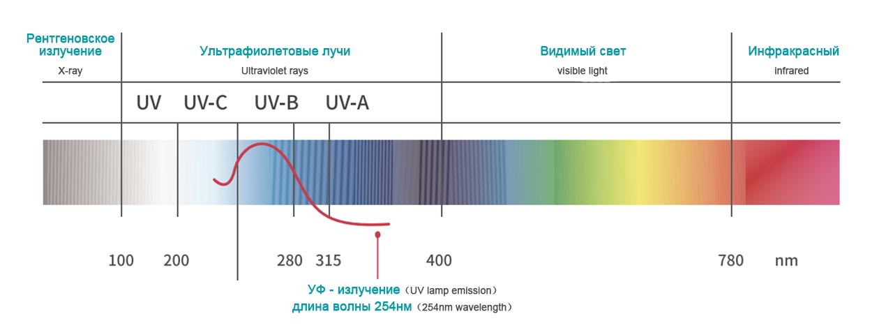УФ – излучение делится на четыре диапазона: а/б/с/D. С – диапазон оказывает бактерицидное действие. Из них ультрафиолетовая стерилизация является самой сильной при длине волны 254 нм.