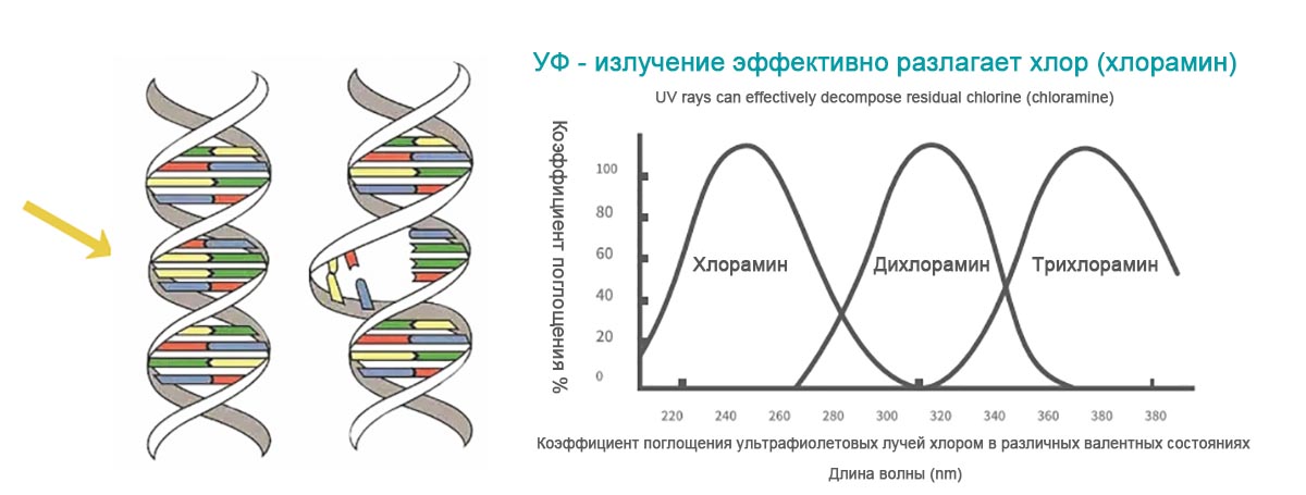 По сравнению с остаточным хлором (хлорамином) ультрафиолетовые лучи более полезны для здоровья и не имеют побочных эффектов; Ультрафиолетовая технология получения связанного хлора (хлора), полученного путем хлорной дезинфекции, является причиной запаха хлора в воздухе закрытых бассейнов. Хлорамин также вызывает боль в глазах, а аллергия на коже также является основной причиной коррозии композитных конструкций в крытых бассейнах. Ультрафиолетовые лучи не только разлагают хлорамин, но и самоочищаются. Ни один микроб не может быть невосприимчив к ультрафиолетовому излучению, даже некоторые болезнетворные микроорганизмы, которые не может убить хлор.