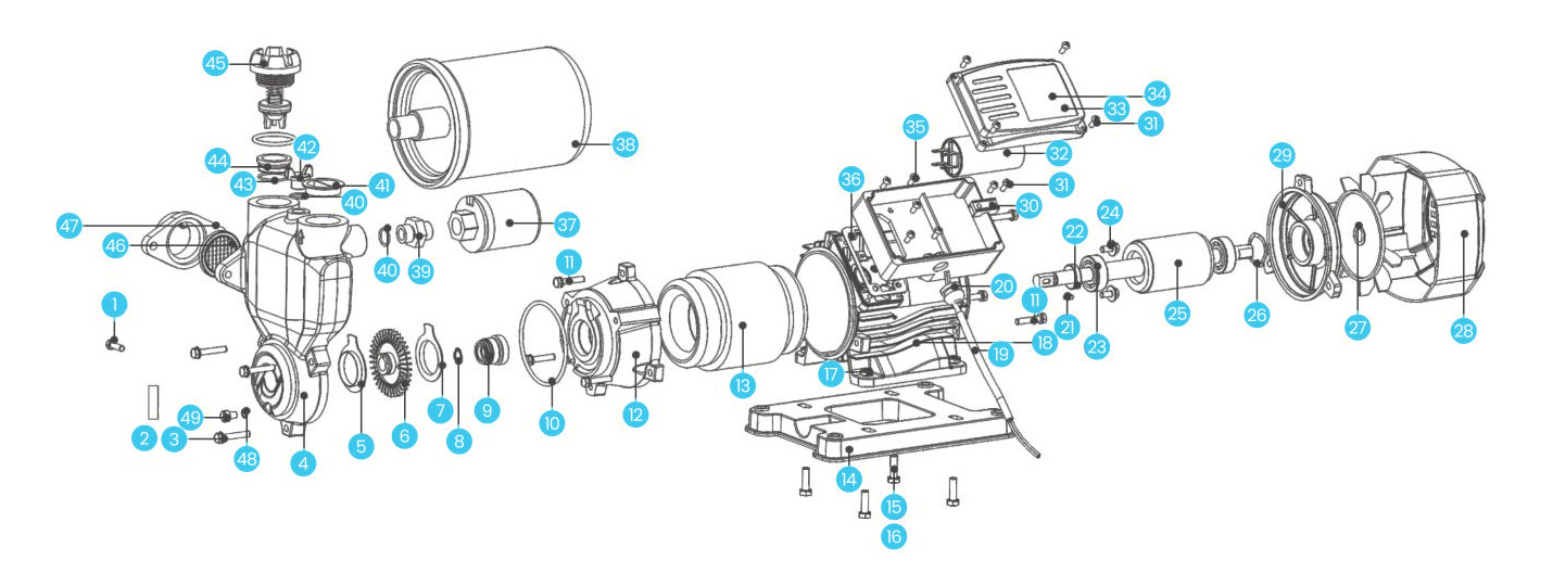 | 4 | Корпус насоса | 17 | Орехи | 30 | Кабельный пресс | 43 | Кольцо "О" | ||||||