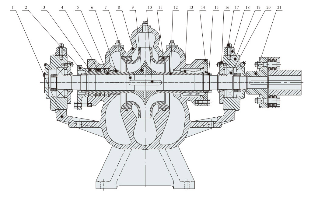 Ось насоса поддерживается двумя однорядными центрирующими шарикоподшипниками, которые установлены в корпусе подшипников с обоих концов насоса и смазываются смазкой. Двойное абсорбционное уплотнительное кольцо используется для уменьшения утечек на рабочем колесе. Управление насосом осуществляется напрямую с помощью упругой муфты. (При использовании резиновой передачи следует установить дополнительную опору).