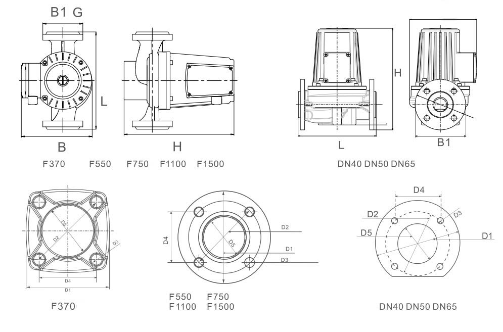 | (Вт) | (м³/ч) | (м) | 220 В/50 Гц | 220 В/60 Гц | 380 В/50 Гц | L | B | Б1 | H | G | Д1 | Д2 | Д3 | Д4 | Д5 | ||