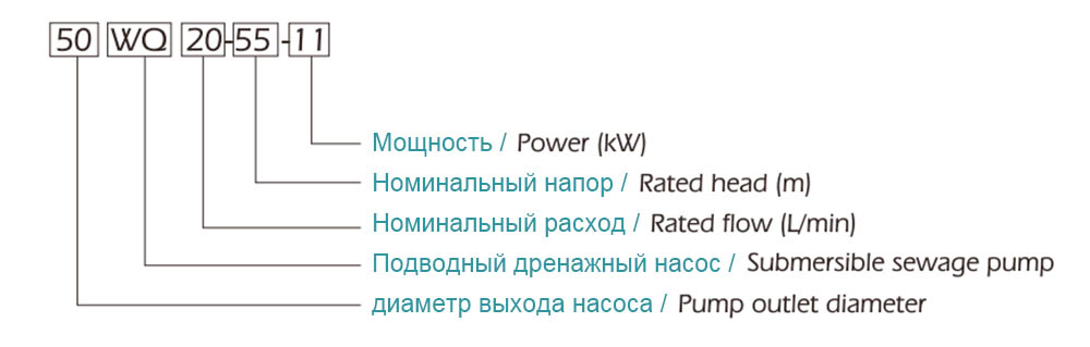 | 50WQ(Д)9-22-2.2 | 9 | 22 | 2.2 | 3 | 380/220 | 50 | 2900 | 62×25×28 |