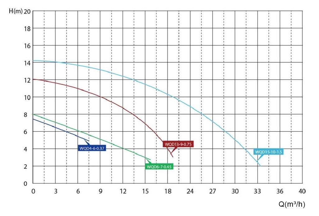 Серия WQD благодаря своим небольшим размерам и легкому весу особенно подходит для обширной подземной перекачки в сельской местности, орошения сельскохозяйственных полей, обогащения кислородом и дренажа в аквакультуре, орошения садов и отелей, столовых, небольших высотных сооружений и других мест водоснабжения.