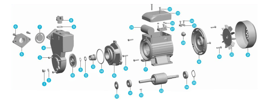 | 9 | Кольцо "О" | 21 | Крышка вентилятора | 33 | Ротор |
