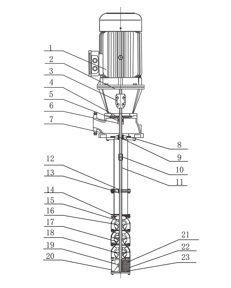 Секция подачи воды подключается фланцем, а материал трансмиссионного вала — 2Cr13 или нержавеющая сталь.