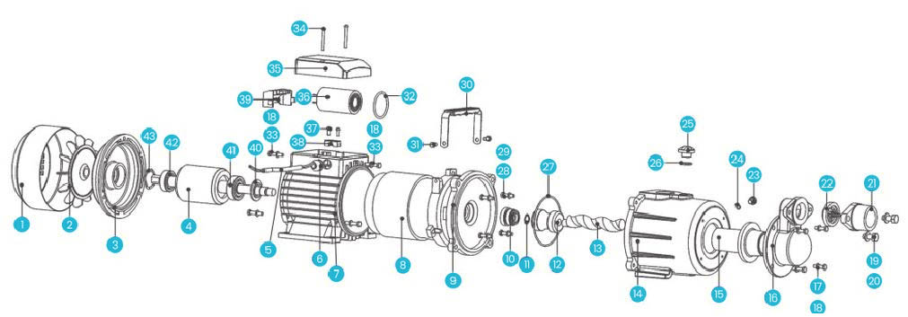 | 5 | Электрический кабель | 16 | Крышка корпуса насоса | 27 | Кольцо "О" | 38 | Кабельный пресс | |||||||